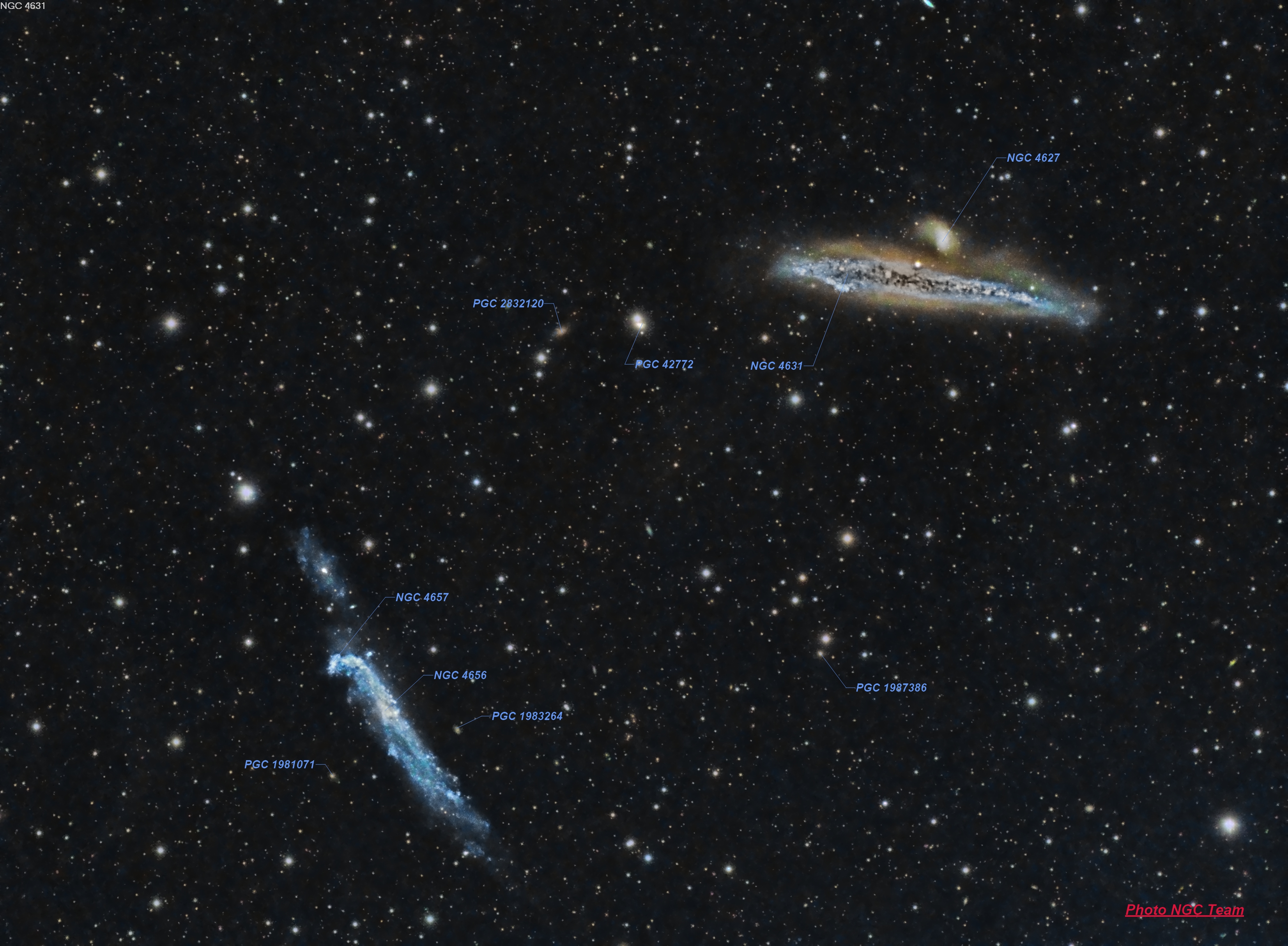 NGC 4631 appelée la galaxie de la Baleine est une galaxie spirale barrée vue par la tranche et située dans la constellation des Chiens de chasse à environ 28 millions d’a.l. de la Voie lactée.. Elle est de magnitude 9,2 et d’une dimension apparente visuelle de 15,2′ x 2,8′.