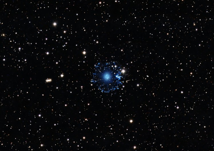 La formation de NGC 6543 remonte à plusieurs milliers d’années, lorsque l’étoile centrale, semblable au Soleil, a atteint la fin de sa vie. À ce stade, l’étoile a épuisé son carburant nucléaire et a commencé à subir des processus de gonflement et de contraction, expulsant ses couches externes dans l’espace environnant. Le noyau stellaire restant, la naine blanche, est la partie la plus dense de l’étoile et continue à émettre un flux intense de rayonnements ultraviolets, ionisant le gaz environnant et créant ainsi la nébuleuse planétaire que nous observons aujourd’hui.