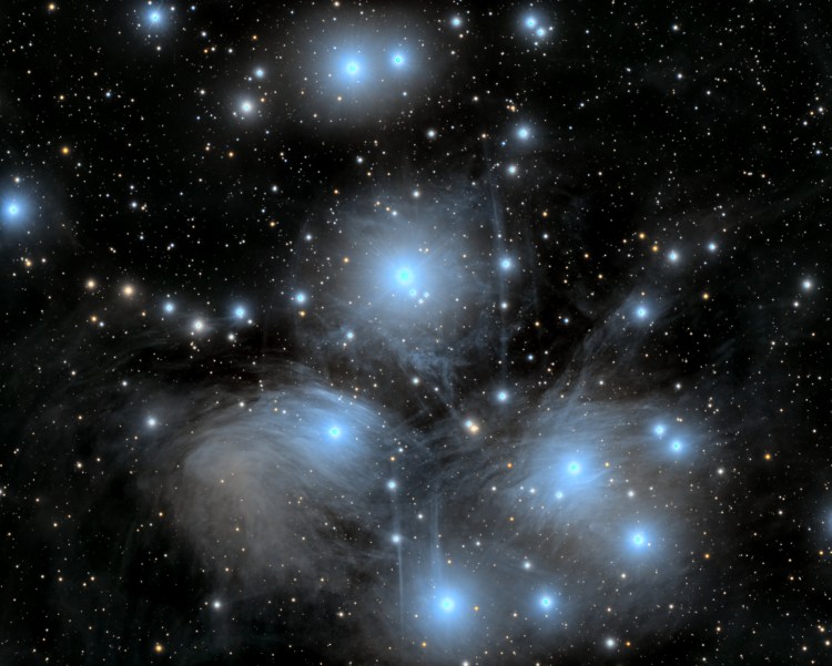 L’amas ouvert des Pléiades est situé à environ 440 années-lumière de la Terre dans la constellation du Taureau. Cet amas jeune, formé il y a environ 100 millions d’années, est composé principalement d’étoiles chaudes de type B, qui brillent d’un intense éclat bleuté. Le nombre d’étoiles le composant est estimé à environ 3000.